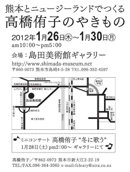 Yuko Takahashi will be showing her pottery at the Shimada Bijutsukan between January 26 and 30.