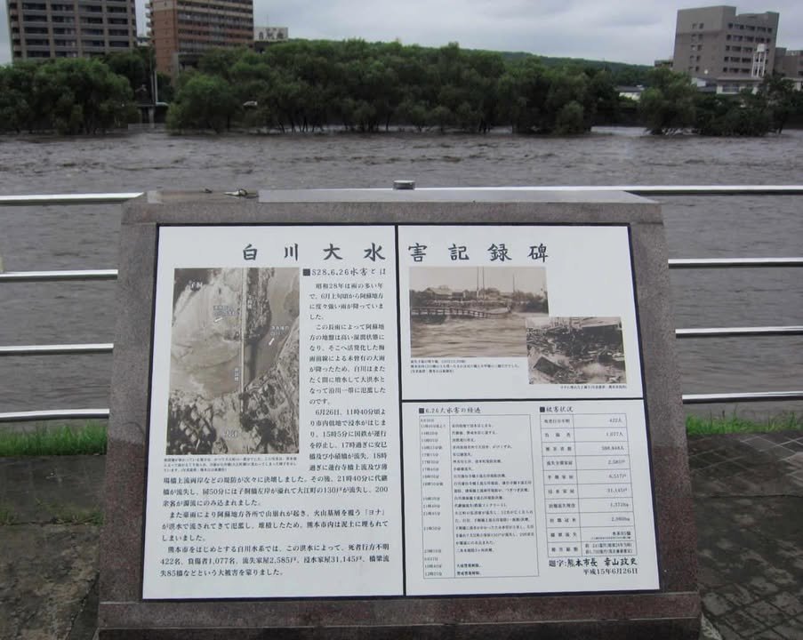 “In 1953 the Shirakawa River overflowed. One of the Japanese web sites I looked at said that the total of dead and missing was 422, while another said that the total was more than 500. Unusually heavy rain caused volcanic ash and sand from the Aso volcano to be swept into the river and carried to the city where it took out 85 bridges and inundated 31,145 homes.”