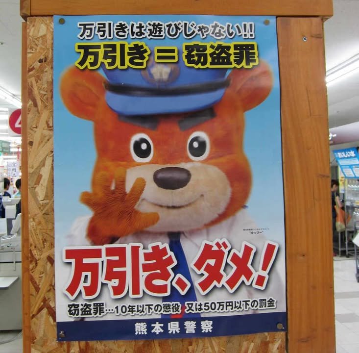 There’s nothing like a teddy bear in a police suit to strike fear into the hearts of Kumamoto’s shoplifters. (Anti-shoplifting poster, Kumamoto, Japan)