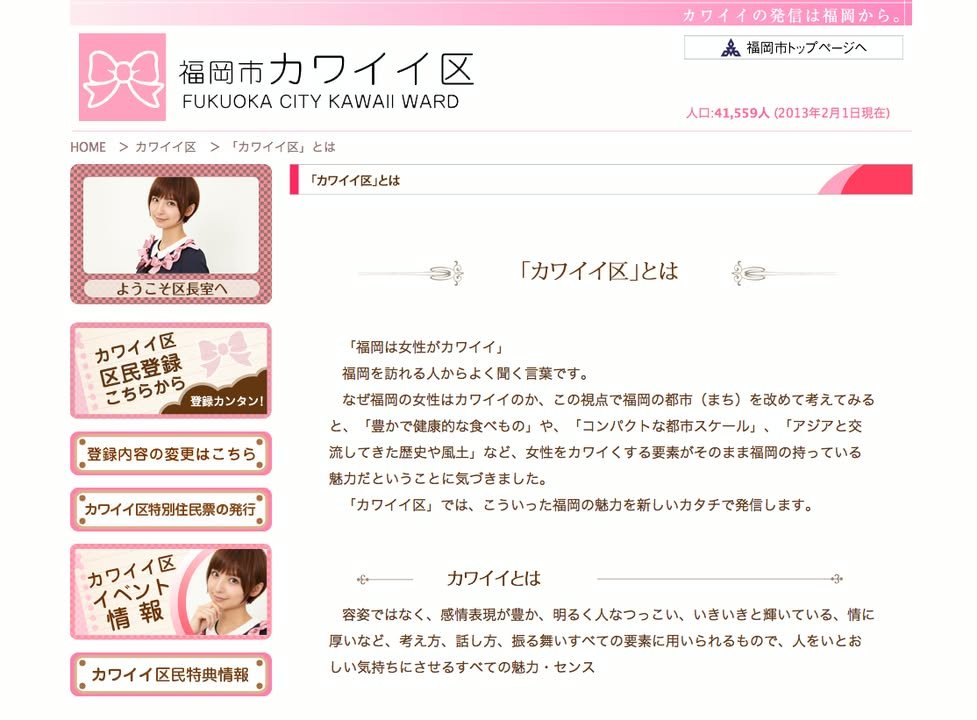 “「福岡は女性がカワイイ」福岡を訪れる人からよく聞く言葉です。” ("‘The women of Fukuoka are kawaii [cute].’ This is a comment one often hears from visitors to Fukuoka.") http://kawaiiku.jp/about_kawaiiku