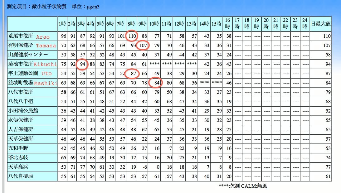 PM 2.5 levels have been high today. March 5, 2013 at 08:11 JST 2013 PM 2.5 levels have been high today. ↗ View original post on Facebook For a link to the original post on Facebook, open this page on a computer. ← 2013-03-05 06:59 JST 2013-03-05 12:04 JST → Around this time … 2013-03-07 11:12 JSTSt. Patrick's Day Info Fair & Costume Contest 2013-03-05 12:04 JSThttp://blogs.wsj.com/japanrealtime/2013/03/05/kumamoto-resid … 2013-03-05 23:12 JSThttp://ajw.asahi.com/article/behind_news/social_affairs/AJ20 … 2013-03-05 13:02 JSTClick on the link to see a video with images of downtown … 2013-03-05 12:47 JSTThe situation in Kumamoto was the second news story on NHK's … 2013-03-05 08:11 JSTPM 2.5 levels have been high today. (this post) 2013-03-05 06:59 JSTParty with Hatsune Miku! in Greenland 2013-02-28 02:21 JSTIf you're interested in tea . . . 2013-02-27 12:19 JSTOn Tuesday (I first wrote "Monday" but Tuesday is correct) … 2013-02-25 01:50 JSTCycling event 2013-02-25 00:51 JSTI saw something about this on national TV news the other …