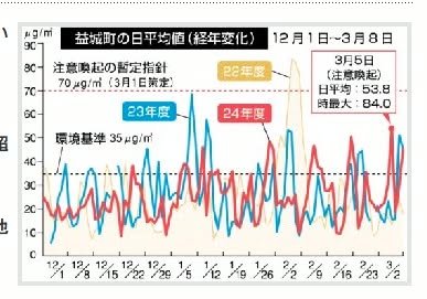 The media frenzy about the PM2.5 issue is new this year, but the air quality problem itself has been around for a while. This graph from a Kumanichi article on the issue shows similar levels in the past few years.