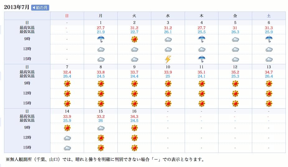 And the heat goes on! This web page shows the temperatures in Kumamoto for the past couple of weeks. Since last Monday the high temperatures have been between 33.2 C (91.7 F) and 35.2 C (95.4 F). This page also allows you to check the highs and lows in past years.
