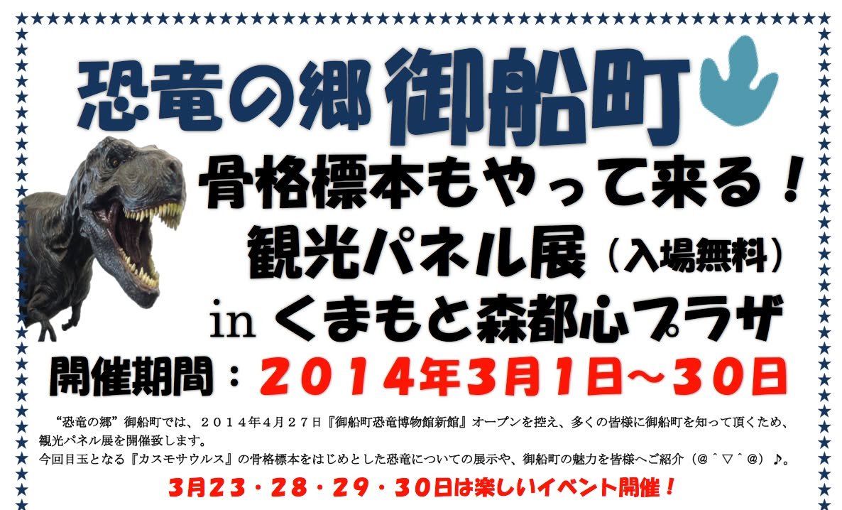 In March, some skeletal preparations of dinosaurs that are normally housed in the Mifune Dinosaur Museum will be on display at the Kumamoto Shintoshin Plaza, which is located near Kumamoto Station.