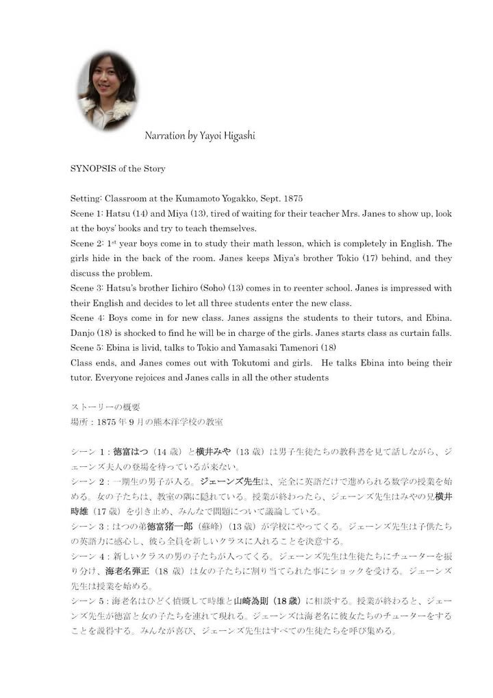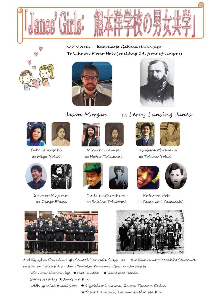 but this work has not yet been performed in English. (The translation was done by Judy Yoneoka for this occasion.) The scene is 1875 at the Kumamoto Yogakko. Part of the play will be in Japanese but much of it will be in English and the program (see image) will help you follow along.