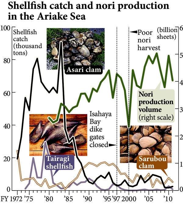 This article is about the Ariake Sea. By car, it takes a long time to get from Kumamoto to Nagasaki but, as you can see from the map, they are not far apart if you travel over water. The proximity has meant that decisions made in Nagasaki can have a large impact on the whole of the Ariake Sea – and people in Kumamoto who rely on it for their livelihood. Specifically, there is concern and controversy about the sealing off of the Isahaya Bay in 1997 in order to reclaim land for farming. The mudflats in the bay seem to have played a significant role in maintaining good water quality in the Ariake Sea before the dikes were installed and now there are claims that sealing off of the bay has resulted in serious environmental degradation.