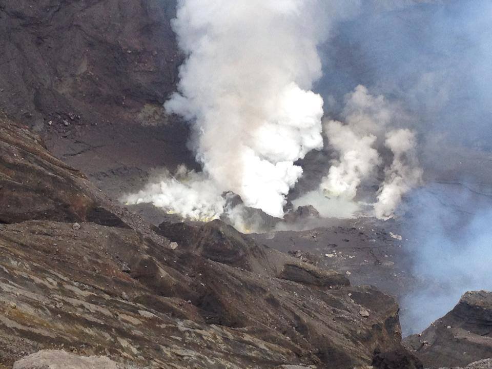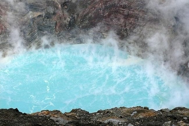 I learned later from a curator at the nearby Volcano Museum that the pool dries up like this when the volcano is particularly active. As you can see, a lot of steam is being released. I was also told that the reason we were able to look down into the crater today is that wind happened to be blowing in the right direction. If the winds had been blowing the steam toward the viewing area, it would have been closed off.