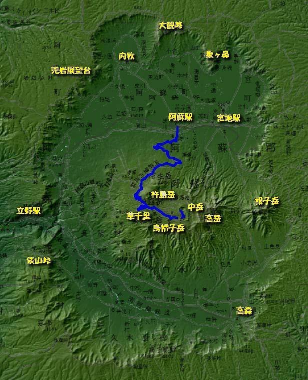 By the way, you may sometimes see statements about the Aso Caldera being the largest in the world. This is not correct, though it is among the largest. The green map shows the outline on the caldera, which is far, far larger than the volcano itself. Here’s an accurate explanation: