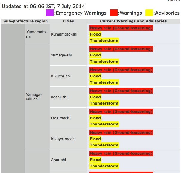 This table is the best source I have been able to find so far for information about weather-related warnings. One problem, however, is that it doesn’t say anything about the evacuation recommendations for Amakusa. It sure would be nice to have the most important information neatly packaged in one place.