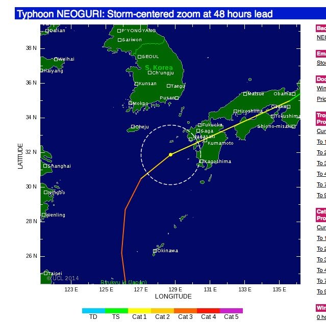 Good news! According to this, when the typhoon hits Kumamoto, it is now predicted to be a Category 1 tropical storm – not a Category 4 as was predicted earlier. With winds of 119-153 kilometers per hour (74-95 miles per hour), a Category 1 storm can still cause serious damage but, obviously, it’s no where near as dangerous as a Category 4.