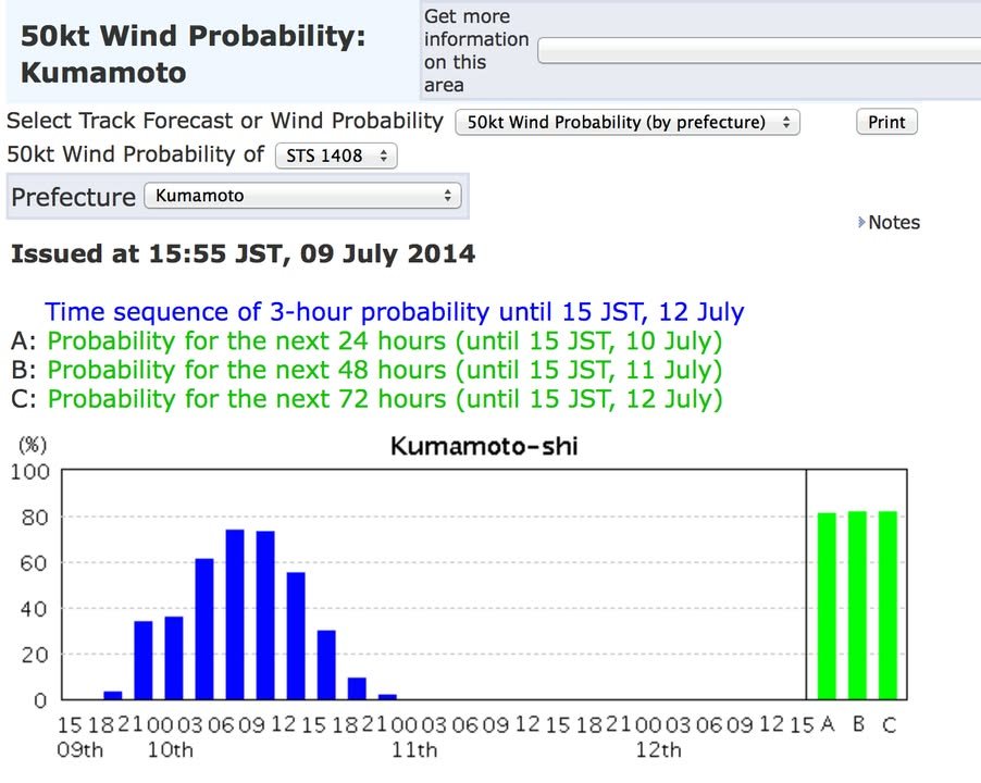 It looks like the winds in Kumamoto will be strongest at about 9 AM tomorrow. The graph shows the probability of winds over 50 knots. According to the page I found at the second address shown below, 50 knots is associated with the following kinds of impacts: