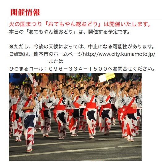 Due to the weather, there was some doubt about whether or not the Otemoyan Dance could go on as scheduled. The official website site says, in essence, “the dance is on!” However, they also say that there’s still a slim chance of cancelation due to the weather. I hope you all have a great time and that there is little no rain. The weather forecast indicates only light rain.