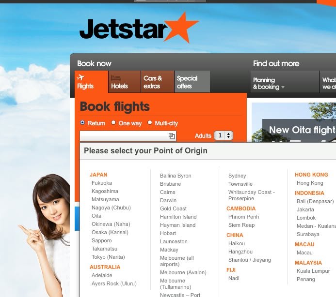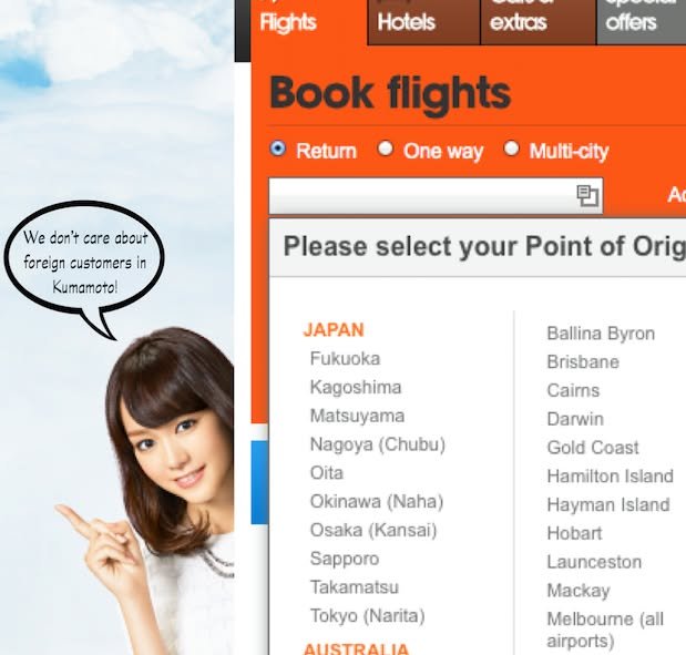 I illustrated my feeling about this asymmetry between English and Japanese by adding a little comment to the screen shot I took of the English search page on the Jetstar site.