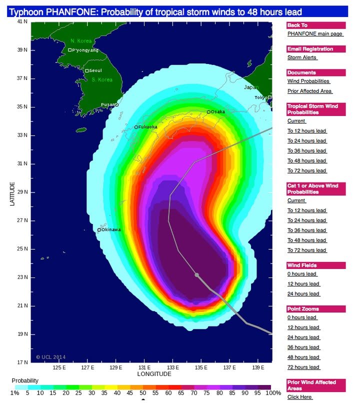 There’s a strong storm coming this way. The good news is that it looks like it will pass by the south-east side of Kyushu. That’s good because tropical storms in the northern hemisphere spin counter-clockwise and for that reason the winds that hit Kyushu first will be weakened by having to travel over land before arriving in here. Still, it’s a very intense storm system (currently Category 3 but predicted to return to Category 4 as it approaches Kyushu) so it shouldn’t be underestimated, particularly if you are in a vulnerable area.