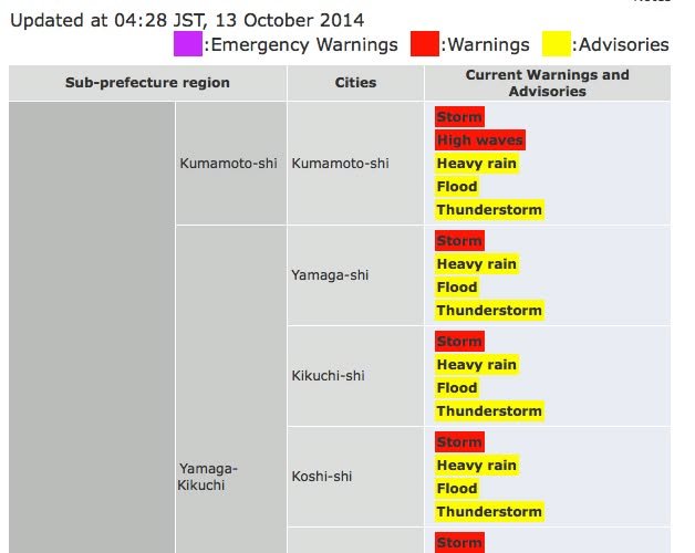 This is a screenshot from the Japan Meteorological Agency’s website. It shows “storm warnings” for all of Kumamoto. The Japanese side of the site presents these as 暴風警報 (bofu keiho; strong wind warnings). Kumamoto University cancels classes when such warnings are issued for Kumamoto City. However, if warnings are rescinded, Kumadai may hold classes later in the day. The details are explained in the following pdf:
