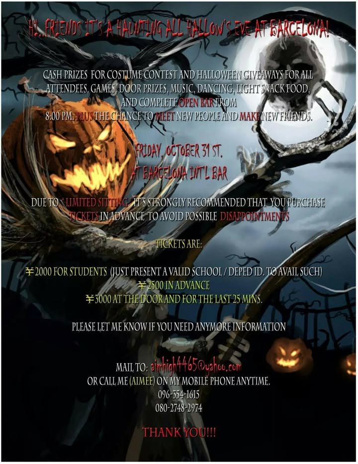 —— start quote —— What are u doin this Halloween? Every adult is welcome 2 attend at Barcelona Bar’s Halloween Costume Party.Come dressed to impressed in your best costume for a chance 2win cash prizes One(1) BEST OVERALL ¥15,000+gifts Two(2) MOST ORIGINAL ¥10,000 each +gifts Three(3) BEST SCARIEST¥5000 each +gifts Complete w/OPEN BAR at 8pm,light snack food & games 4all 2enjoy!!! Ticket pricing: ¥2000 for students(present your school DepEd ID to avail such) ¥2500 in advance ¥3000 at the door Due 2limited sitting it’s strongly recomended that u purchase tickets in advance 2avoid possible disappointments. If i can be of any assistance in inquiries about this pls. call 080-2748-2874 (anytime). Thank you —– end quote ——-