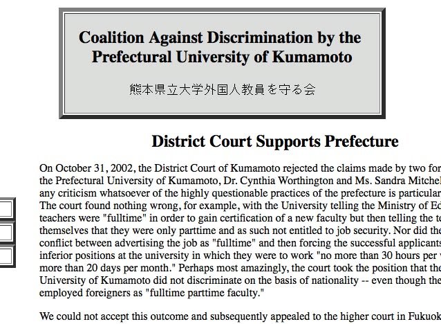 Cynthia Worthington and Sandra Mitchell lost their jobs but the publicity about the case (including many articles in the Kumanichi, Kumamoto’s local newspaper) dealt a significant blow to the Prefectural University of Kumamoto’s prestige. If nothing else, it sent a clear message to institutions throughout Japan that discriminatory employment practices might lead to significant backlash.