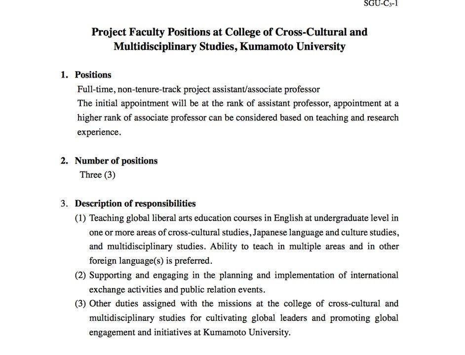 Kumamoto University is advertising three new academic positions. Applications are due by the end of April. For details please go to