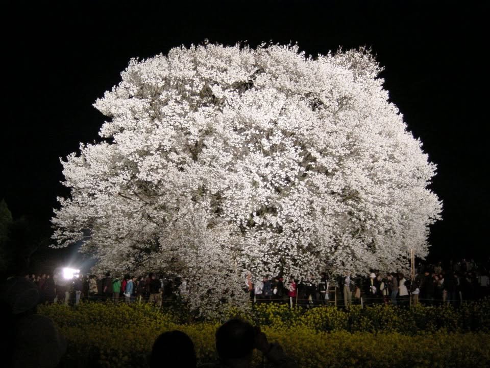 There’s a special word in Japanese for cherry blossoms viewed at night: yozakura; 夜桜. Here’s a photo of the Isshingyo tree in Aso lit up at night. It’s from the following site: