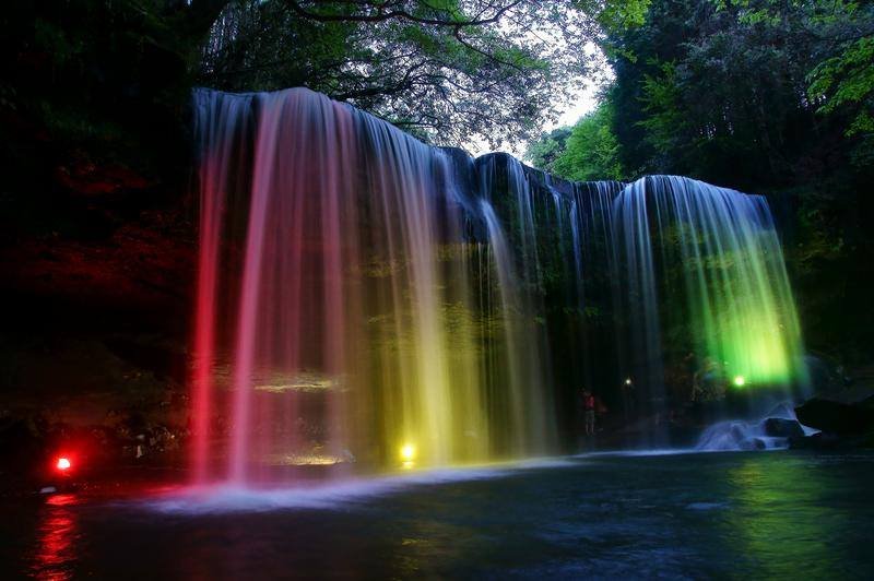 ■Nabega-taki(waterfall) lighting-up Nabega-taki is a beautiful waterfall which you can go behind. Time period: Sat., 2nd. ~ Wed., 6th. May. 17:00~21:00 Place: Nabega-Taki (Oguni Town) Cost: 200yen Access: JR Aso Station → Michino-eki Oguni Yuu Statio (about 1 hour by bus) *It takes about 15 minutes by taxi For more information: Oguni Town Office Information Division (TEL: 0967-46-2113) *Japanese language only