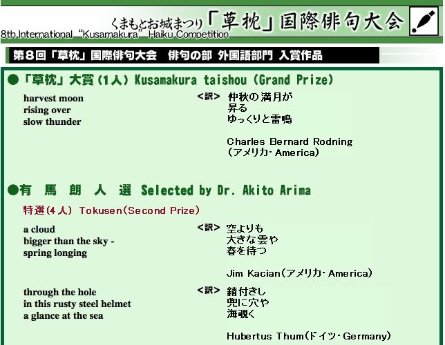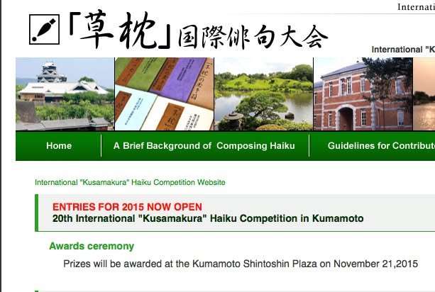 Did you know that Kumamoto has an international haiku competition? Poets from all over the world submit poems in English through the web. The deadline is September 9 and 50,000 yen will be awarded to the winning submission.