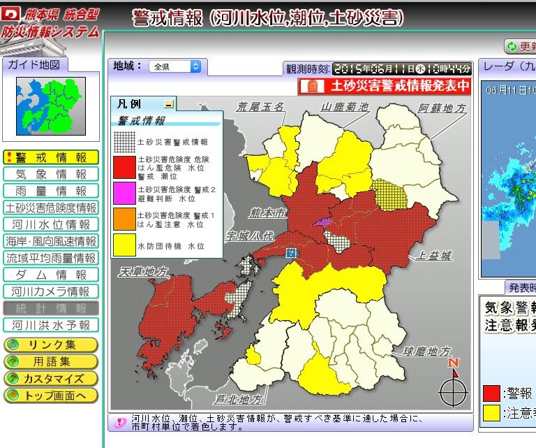 Here’s an image from a website managed by the prefecture. It indicates that the risk of mudslides and flooding is quite high. Unfortunately, even if you read Japanese, I think it’s difficult to get a clear idea of exactly what you should or should not do if you live in one of the red zones. I have other work to do today but, if I can, I’ll try to follow up with more information. If you are worried, perhaps it’s best to check with neighbors or colleagues to learn about the situation in your particular area.