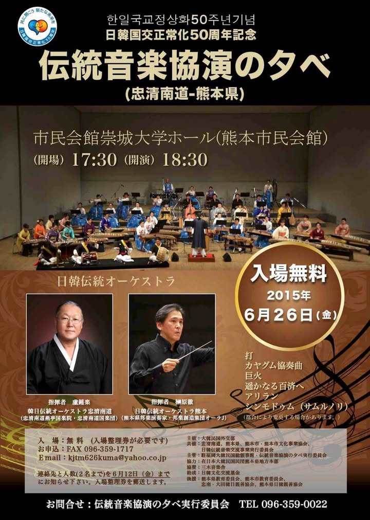 On June 26, a concert in which players of traditional Japanese and Korea instruments perform together will be held at the Shimin Kaikan Sojo Daigaku Hall (across the street from the International Center, near the castle). The announcement says that it is free but that you need to have a ticket. Though the deadline has passed, it still may be possible to get a ticket. If you are interested, send an e-mail to the address listed.