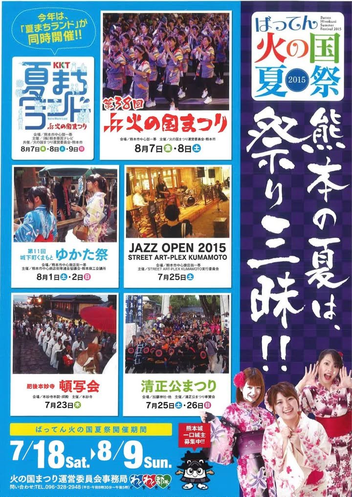 In addition, a Yukata festival will be held on August 1st and 2nd and then the main event, the Hinokuni Matsuri (festival) will be held on August 7th and 8th. For more information about the Hinokuni Matsuri see