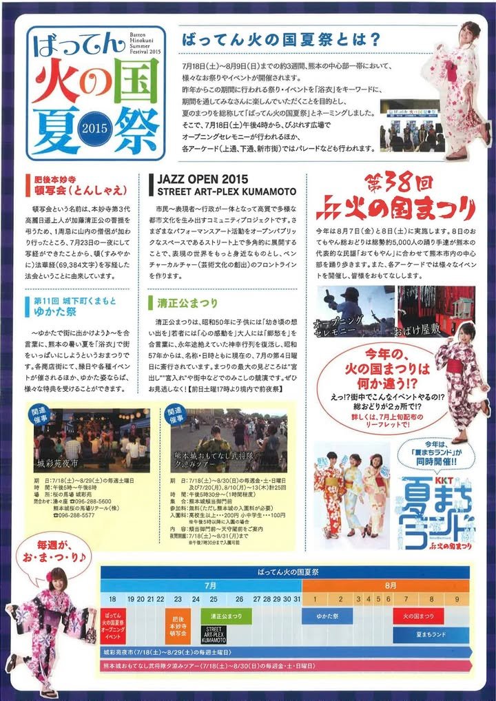 The opening ceremony of the Batten Hinokuni Summer Festival will be held at 4 PM on July 18th (Saturday) at the Bipuresu Square (across the street from Tsuruya Department Store).