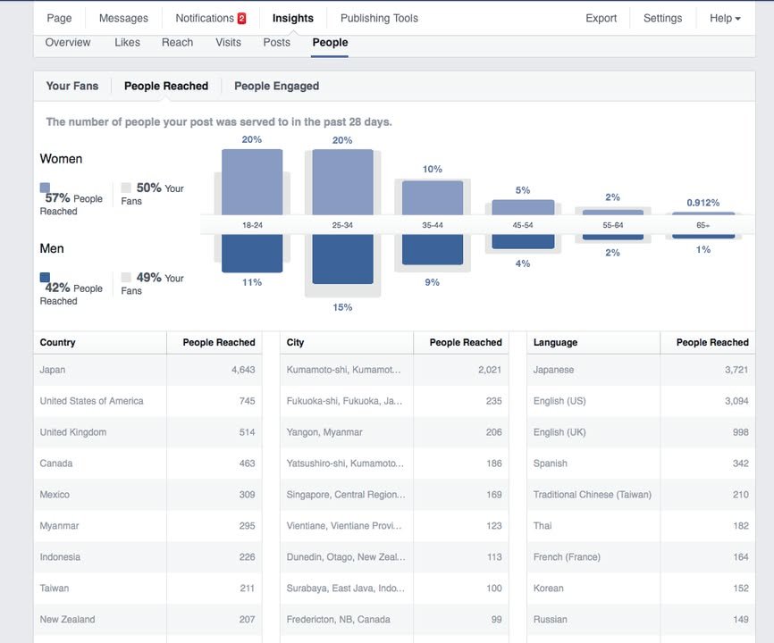 There are many things about Facebook that I don’t like or am concerned about (no decent search function, tracking of personal information of users, etc.) but, as the manager of this page, I’m glad to be able to see how it is being used. This screen shot shows demographic information about who has been looking at posts over the past month. I downloaded the statistics and found that about half of the people looking at the posts are not in Japan. I thought that was interesting because the posts are primarily intended to be useful for people who are here now or planning to come some. The statistics also indicate that about 40% of the people who see the posts (post reach) are native speakers of Japanese but that only a little more than 20% of the people who have “liked” the page are Japanese. I hope more Japanese people will participate actively in the future.