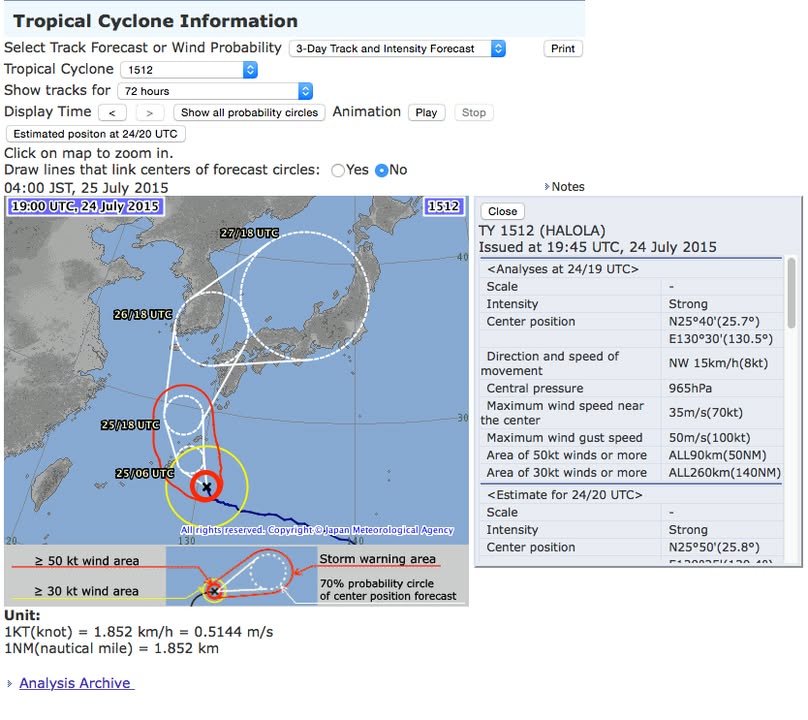 Here’s another typhoon update. The first image indicates that Kumamoto has a less than 50% chance of experiencing tropical storm winds, but I think it’s clear that we will feel the effects of the storm to some extent. The second image indicates when the storm will be closest to Kumamoto. Unfortunately, the times are UTC, which is nine hours behind local time in Japan. In a nutshell, it looks like the storm will be closest to Kumamoto by about Sunday afternoon or Sunday evening.