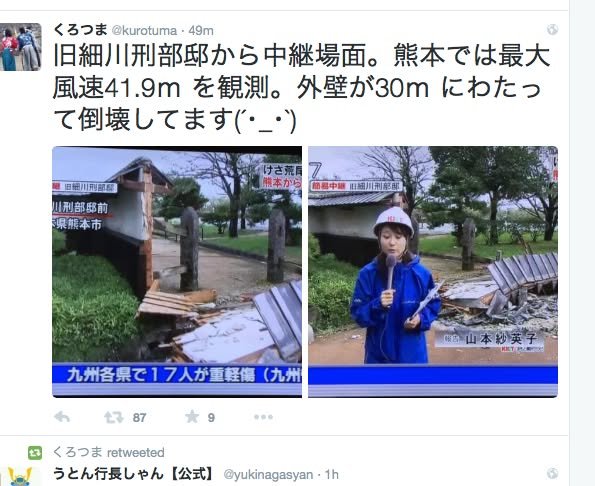 A wall on the grounds of the Hosokawa Gyobutei (Hosokawa Mansion), near the castle, has been toppled by the storm. For more information about this traditional samurai residence (one of Kumamoto’s tourist attractions) see
