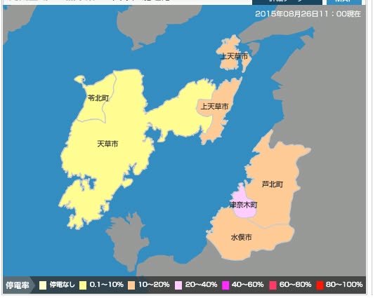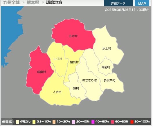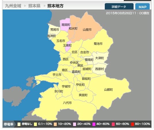 Though power has returned to many homes, there are still areas that do not have electricity. The interface is in Japanese but it is possible to get details, including estimates of when the power can be restored, on the Kyuden site. The situation appears to be worst in the Hitoyoshi area, particularly Itsuki and Kuma. The mountainous terrain in these areas makes them susceptible to landslides and then that same terrain makes restoration of basic utilities difficult. The Kyuden site indicates that most areas that do not have power now will have it by tonight or tomorrow. In regard to Itsuki and Kuma, however, Kyuden says that it is still assessing the damage.
