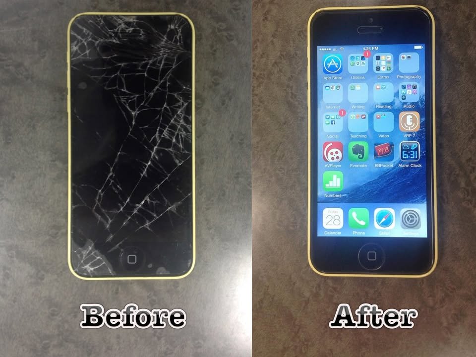 Today I dropped my iPhone, causing the damage you see on the left side of the “before-after” photos. The “after” part was taken care of by the good people at Smapho Dr., located just across the river from downtown Kumamoto. It cost me a little over 10,000 yen (I have an iPhone 5c) but that was slightly less than the Apple fee. What was even better for me was that I could take it in at 2:30, do a little shopping in the Daiei across the street, and then at 3:00 when I returned it was already done. If you want to be sure to get this kind of service, however, you need to call ahead to check to make sure that they have the parts required for your phone and then make an appointment.
