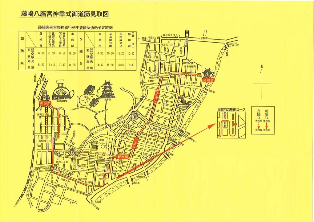 This map shows the route and times for Sunday’s parade. You can find the original at http://www.fujisakigu.or.jp/reisai/onmitisuji.html