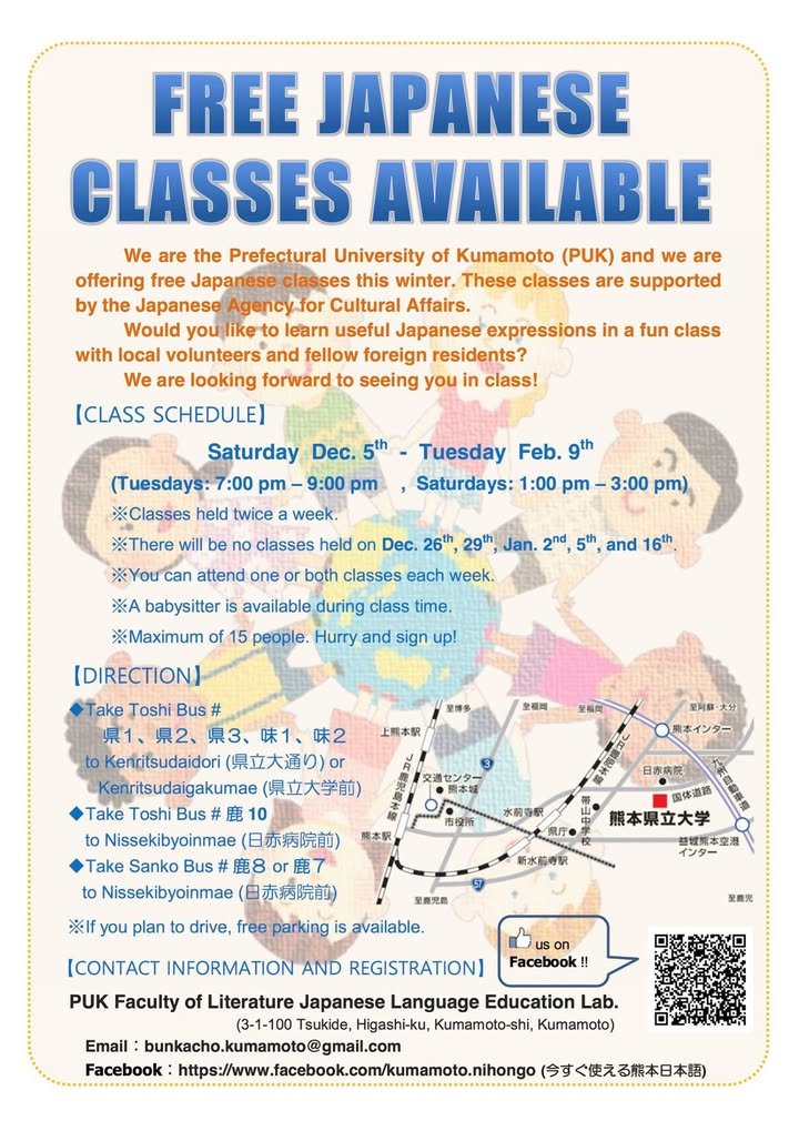 Free Japanese classes November 4, 2015 at 03:38 JST 2015 Free Japanese classes ↗ View original post on Facebook For a link to the original post on Facebook, open this page on a computer. ← 2015-11-04 03:14 JST 2015-11-10 13:57 JST → Around this time … 2015-12-15 10:37 JSTHere's a link to a Google map that shows the precise … 2015-12-13 20:41 JSTHere's an update regarding the power plant: 2015-12-10 01:24 JSTI've been busy lately and have found it difficult post … 2015-12-05 23:10 JSTI have a friend with connections to this company. I didn't … 2015-11-10 13:57 JSTSecond Japanese store opening in Kumamoto 2015-11-04 03:38 JSTFree Japanese classes (this post) 2015-11-04 03:14 JSTThis is a shorter version of an article I posted earlier. 2015-11-03 07:16 JSTThose of you who lived near Kami Kumamoto might have used … 2015-11-02 05:39 JSTThe article says that six Santas that have been certified by … 2015-11-01 04:49 JSTI got this question about parking in Kumamoto City. I'm only … 2015-10-31 09:18 JSTThings seem to be picking up at Kumamoto Airport's …