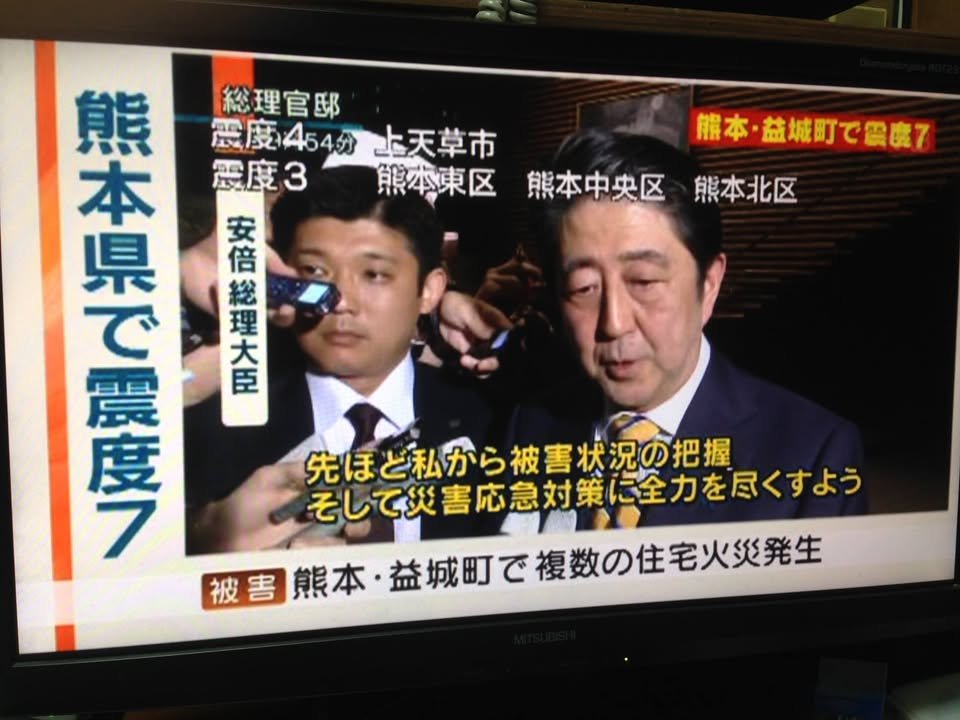 Prime Minister Abe commenting on the quake. His comments about asking his people to find out more about the extent of the damage, etc. are not particularly remarkable. I thought I’d post this, however, as an indication of the level of attention being given to this earthquake. It’s definitely a national issue – not just a local one. I’ve also heard that a request has been made for more Self-Defence Force personal to be sent to Kumamoto to help with relief and rescue efforts.