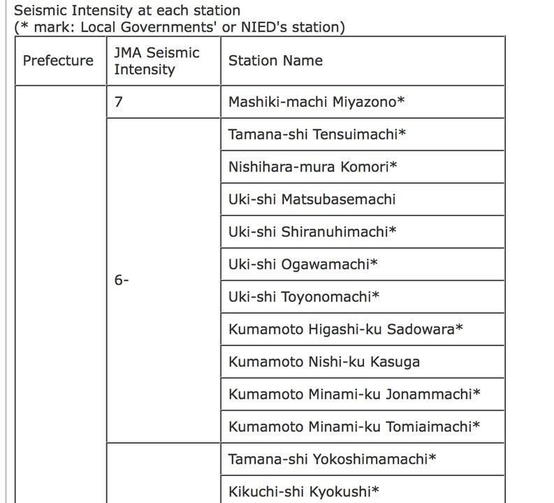 I found the official English page with information about the various quakes. One interesting point is that, although 7 on the Japanese scale was registered in Mashiki, there are no reports of 6+. The next highest intensity rating is 6-. The part of Kumamoto where I live (near Oe) was 5+.