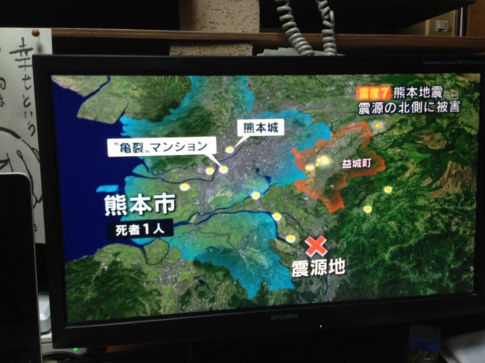 Here’s another still from this evening’s Hodo Station. The yellow points indicate areas where some kind of serious damage was reported. The castle, for example, is one yellow dot. One thing this map illustrates is that the relationship between the severity of the shaking and the distance from the epicenter (shown in red toward the bottom of the screen) is not simple. Mashiki, for example, is not the closest point to the epicenter, though I have heard that the area hardest hit is just above a fault.