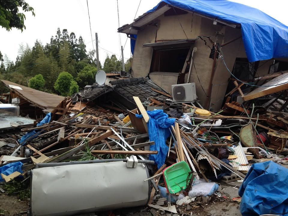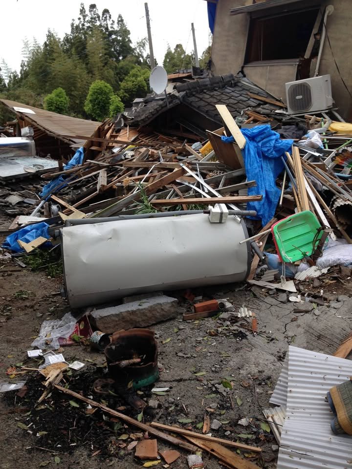 On Friday, I offered to ride my bike to the Mashiki Town Hall (Machi Yakuba) to get some water and other supplies for the family who had been living in this house. At the time, the house was still standing. After I delivered the water, I learned that they were planning to spend the night in front of their house. In the first picture, you can see the remains of a fire they sat around. When the second, magnitude 7.3 earthquake struck, they were still camped out in front of the house. Fortunately, no one was killed but one family member had to be taken to the hospital and get several stitches for a gash in her forehead that she got when the house they were sleeping by collapsed. There were three generations in the family I met and the patriarch (ojiisan) said that he had wanted to sleep inside but the younger family members convinced him to stay outside with them – a decision that saved his life.