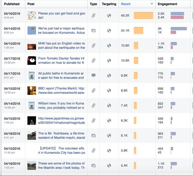 We’ve just had a major earthquake focused on Kumamoto. (24.1K) April 14 at 9:32pm · https://www.facebook.com/Kumamotoi/photos/a.129499733790134.25925.123734781033296/1018142468259185/ Not useful now. Only got a big response because it was the first word out.