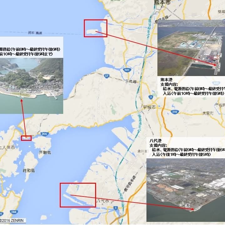 Kirk here. Here’s a map showing three locations (Kumamoto Port, Yatsushiro Port, Misumi Port) where the Japanese Coast Guard is offering showers, pure water, phone charging, and other support.