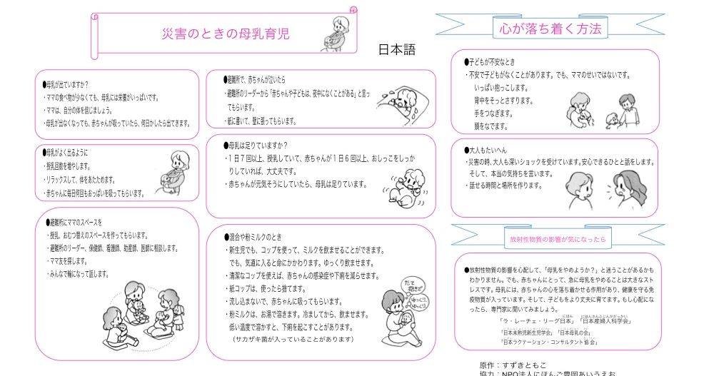 災害のときの母乳育児 Infant care during a disaster Amamentação apos sofrer um catastrofe 灾害的母乳育儿 災害時的母乳育兒 and in Korean language *Copied from 快適母乳生活研究所 and Mo-House (http://stylestore.jp/blog/user/T00522/110520176065/)