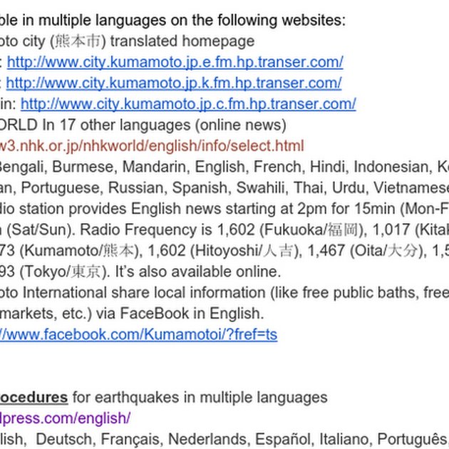 For foreign (non-Japanese) victims from Kumamoto Earthquake *The information below about accommodations, and the baths is temporary, and it might have been changed. (April 18th) News is available in multiple languages on the following websites: · Kumamoto city (熊本市) translated homepage E...