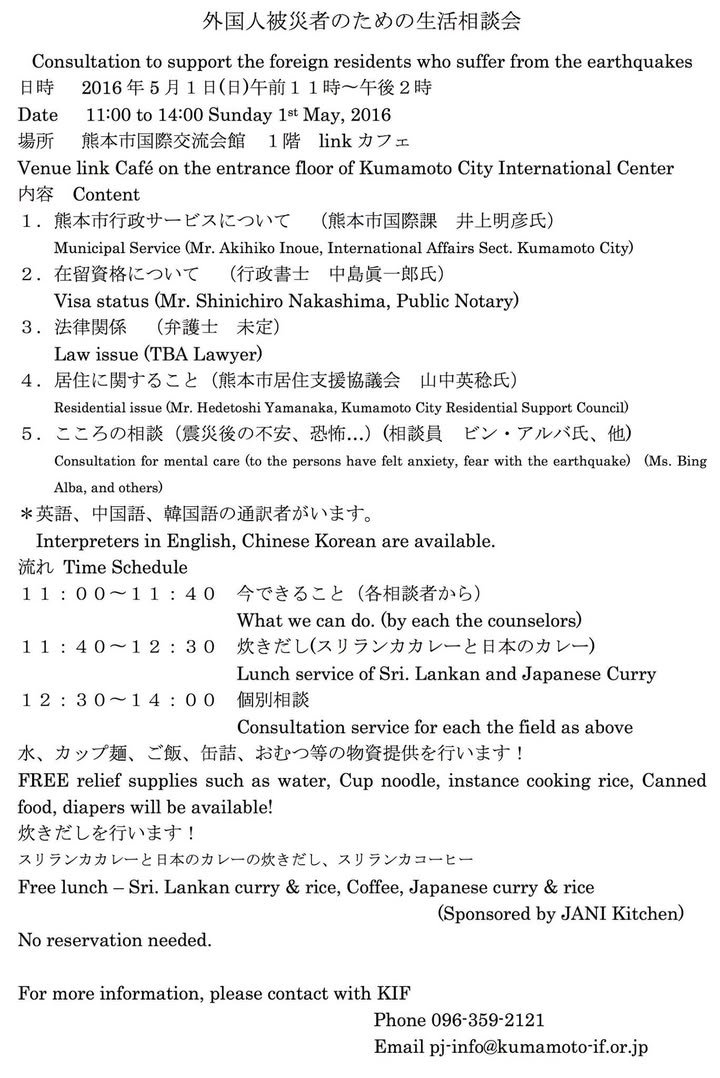 Whether you have questions about getting assistance from city government, problems with visa status, legal issues, difficulty finding an apartment or other issues related to your residence, or would like someone you can talk to about your anxiety and/or concerns about the earthquakes, you will be able to find someone to talk with at the Kumamoto City International Center this Sunday. It will also be a nice opportunity to socialize with other earthquake survivors, enjoy some Sri Lankan curry, and pick up some free relief supplies. See the appended flier for the details.