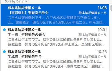 The post I made a few minutes ago about the rain prompted me to check for evacuation notices. The first image you see is from e-mail notifications I have received. The first message says that evacuation orders (not recommendations, orders) were issued for persons in Minami Aso at 10:50 AM. The other two messages say that persons in Uki and Uto have been recommended to evacuate. Persons in areas that are vulnerable to mud slides should pay particular attention to such notices.