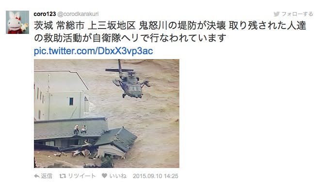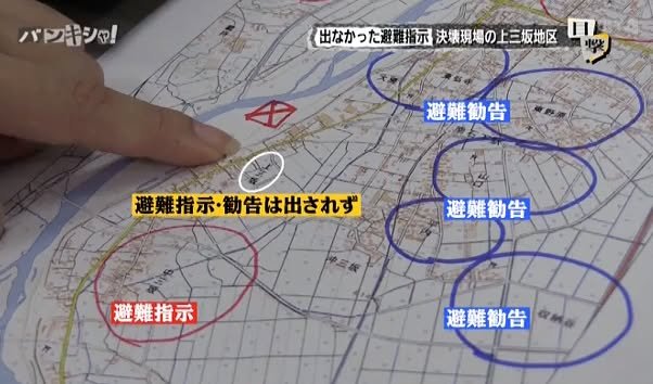 It was not just foreigners who didn’t get the information they needed. The third image shows a rescue being conducted in the Misaka area of Joso City. This area did not receive an evacuation notice until it was too late. The first two images are from a television program called 真相報道 バンキシャ! (Shinso Hodo Bankisha) that was aired on the 13th of September last year. The first image shows how information is issued via text. This is currently exactly the same as the situation in Kumamoto and probably the rest of Japan – notices are issued via text but not in map form. The second image shows how the TV station used a map to determine what areas had received evacuation notices and what areas had not. When the TV reporters plotted the locations on the map, it becomes clear that the spot marked with an X should have received an evacuation notice. When I saw this, I had two thoughts: