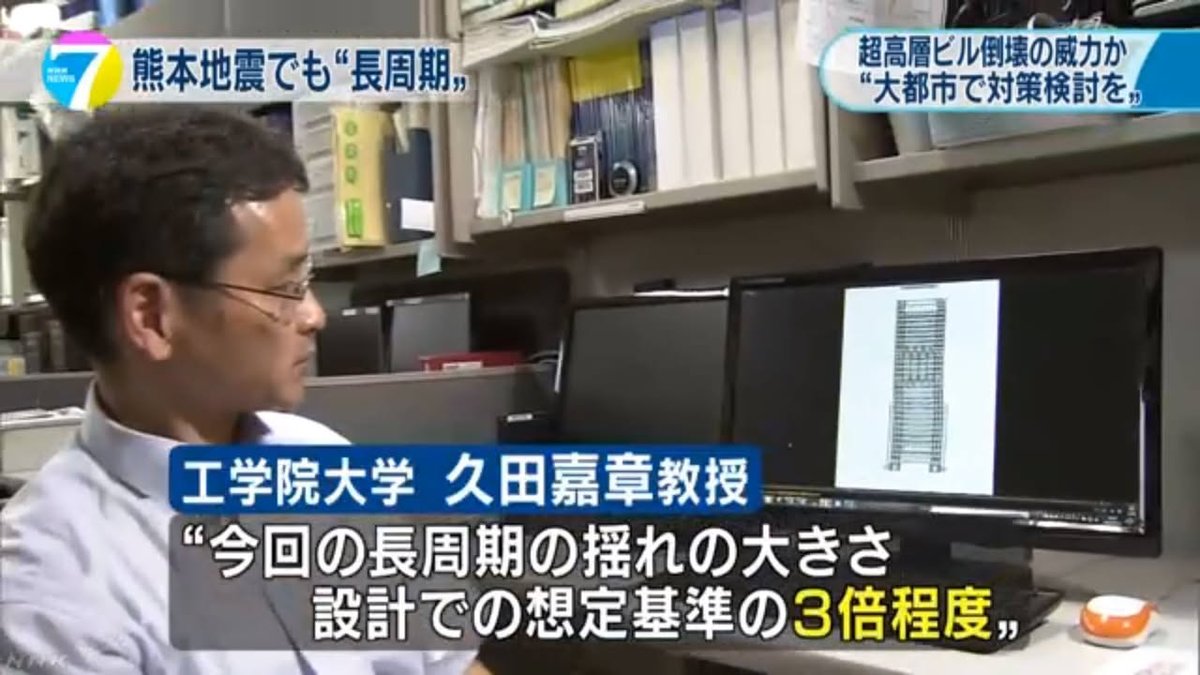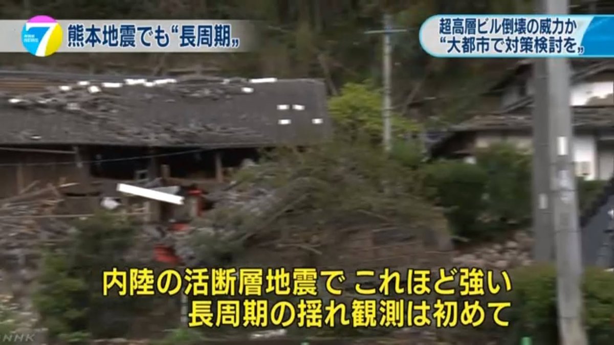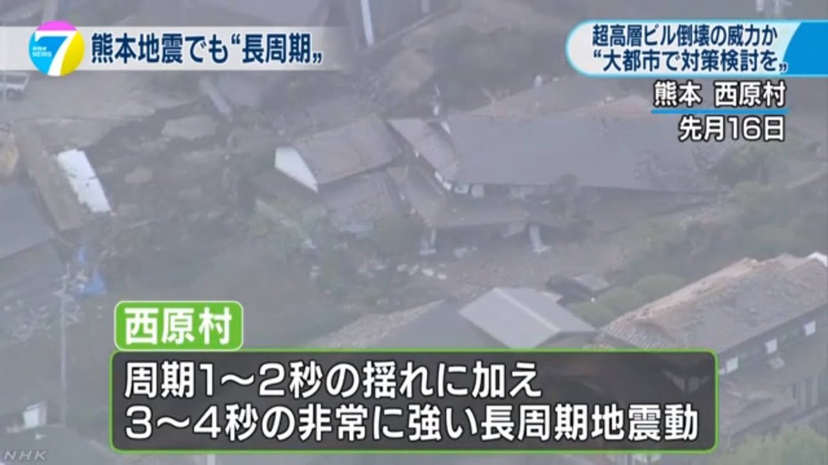 These images are from a report on last night’s NHK evening news. The point was that, in addition to strong waves with a frequency of about 1 to 2 seconds each, Nishihara also experienced waves with frequencies as long as 4 seconds – the strongest such waves ever recorded in an inland area in Japan. The results were devastating for rural Nishihara but the NHK report indicates that such waves are particularly dangerous in areas with high-rise buildings because longer wave frequencies are more likely to “resonate” with tall buildings. The shaking in Nihihara exceeded the design standards for most high-rise buildings in Japan by a factor of three.