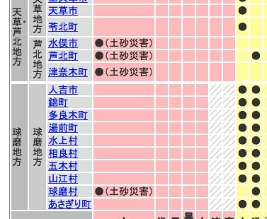 - The areas that have received warnings about possible landslides resulting from heavy rain are near Minamata and Hitoyoshi (both in the southern part of the prefecture).