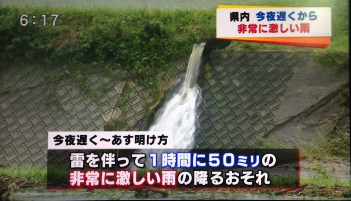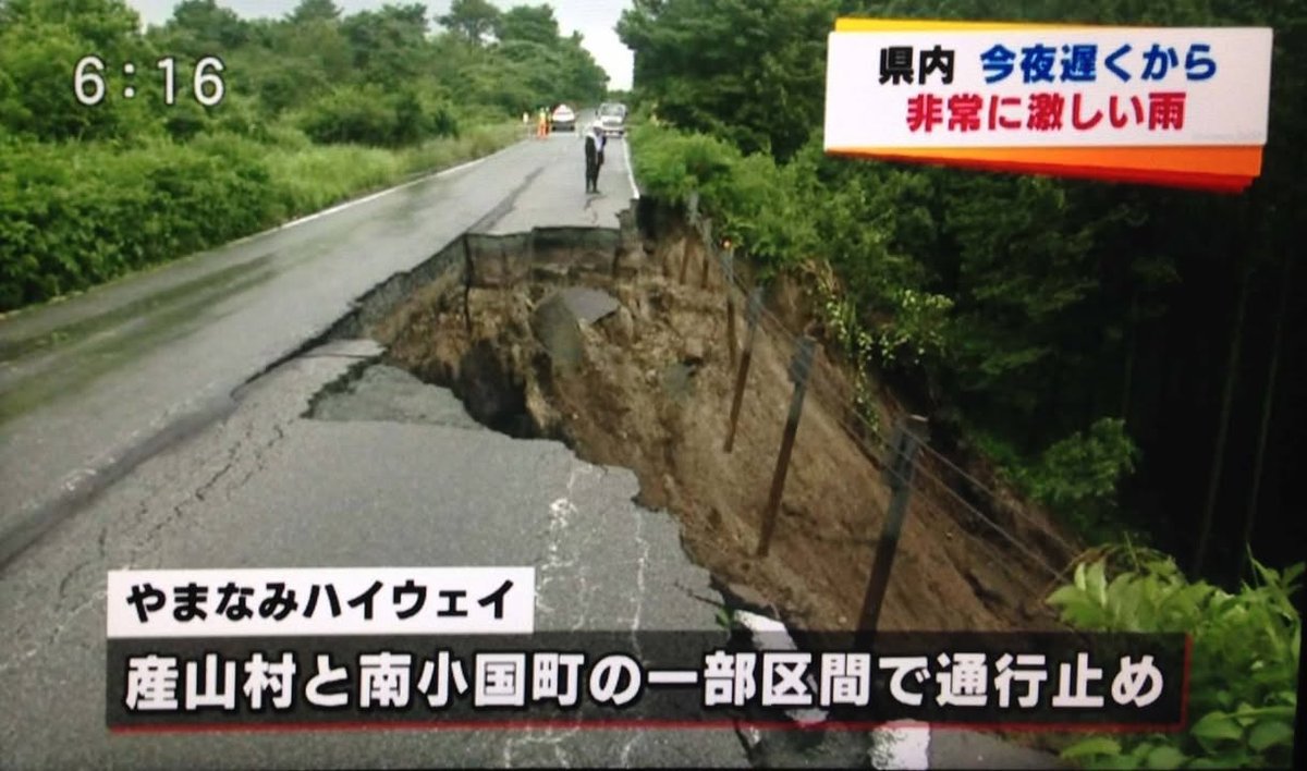Here are some pictures from today’s RKK evening news. The first one is the Yamanami Highway, an important artery in the Aso area. This is recent damage from a rain-induced mudslide. The second image says that more intense rain is expected. As the rains continues, soil becomes increasingly saturated and thus increasingly unstable. It might be wise to avoid unnecessary trips on mountain roads until we have some rainless days.